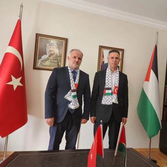 Büyükelçi Dr. Faed Mustafa ile bir araya gelen heyet, 7 Ekim’den beri devam eden Gazze’deki İsrail saldırılarını ve bölgede yaşanan insanlık dramını değerlendirdi. Türkiye ve Filistin halklarının ķöklü kardeşlik bağlarıyla birbirine bağlı olduğunu anımsatan Büyükelçi Mustafa, Türkiye’den gördükleri destekten büyük memnuniyet duyduklarını dile getirerek teşekkürlerini iletti.