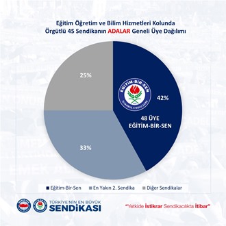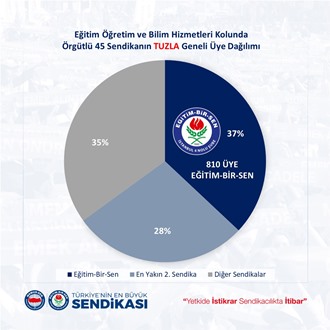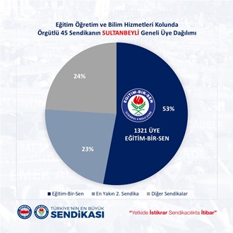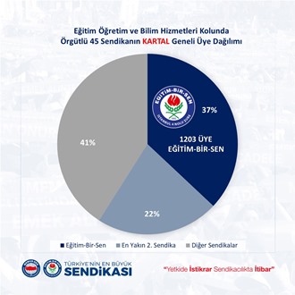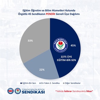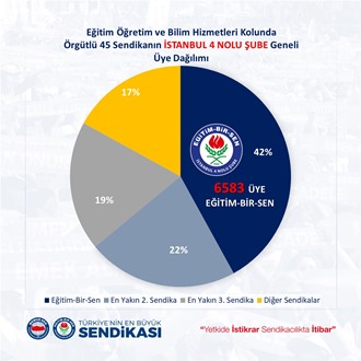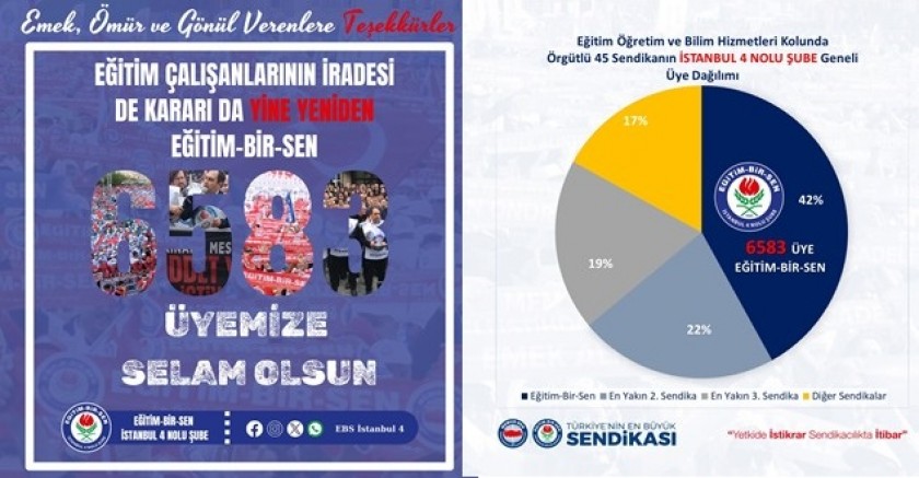 "Eğitim Öğretim ve Bilim hizmetleri kolunda örgütlü 52 sendikanın İstanbul 4 Nolu şube geneli üye dağılımında üye sayımızı artırıp yetkimizi perçinleyerek 6583 (%42) üye sayısına imza attık. Bu başarıda emeği olan Şube ve ilçe yönetimlerine, kurum temsilcilerine, eğitim yöneticilerine ve tüm üyelerimize teşekkür eder, eğitim çalışanlarının haklarını savunma noktasında üzerimize düşen sorumluluğun farkında ve bilincinde olarak, elde etmiş olduğumuz kazanımlara yenilerini eklemek için mücadelemize var gücümüzle devam edeceğimizi bildiririz.