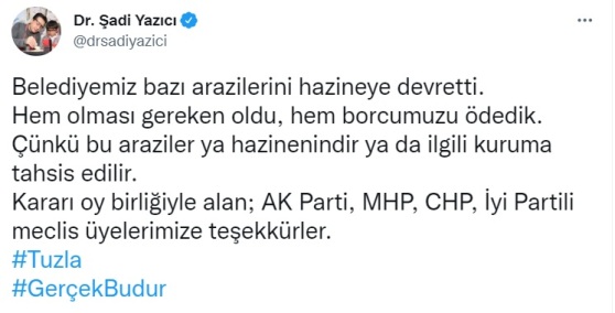 Tuzla Belediye Başkanı Dr. Şadi Yazıcı, “AKP’li Tuzla Belediyesi milyon TL'lik vergi borcu için okul alanları sattı” başlıklı haberlere, Twitter üzerinden #doğrusubudur diyerek tepki gösterdi. Konuyla ilgili açıklama yapan Başkan Yazıcı, kararın Tuzla Belediyesi meclisinde oy birliği ile alındığını ifade ederek, “Belediyemiz bazı arazilerini hazineye devretti. Hem olması gereken oldu hem borcumuzu ödedik. Çünkü bu araziler ya hazinenindir ya da ilgili kuruma tahsis edilir. Kararı oy birliğiyle alan; AK Parti, MHP, CHP, İyi Partili meclis üyelerimize teşekkürler” ifadelerini kullandı.