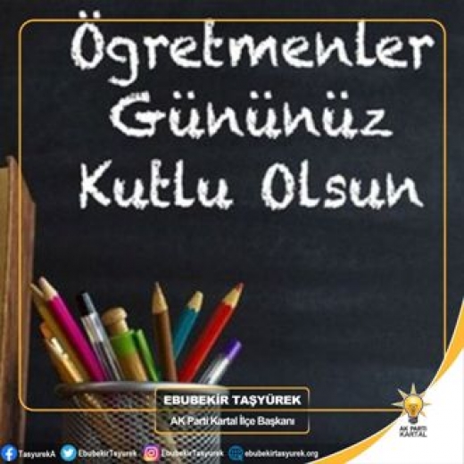 24 Kasım Öğretmenler Günü vesilesiyle sosyal medya hesaplarından bir mesaj yayınlayan Kartal AK PARTİ İlçe Başkanı Ebubekir Taşyürek’te “Şükran ve muhabbetlerimizle bütün öğretmenlerimizin 24 Kasım Öğretmenler Gününü tebrik ediyor, sağlık, sıhhat ve afiyet diliyoruz.” diyerek peygamberimiz Hazreti Muhammed(sav)’in eğitimin ve öğretmenlerin önemini vurgulayan “Ya Âlim ol, ya talebe ol, ya dinleyenlerden ol, yahut bunları sevenlerden ol, beşincisi olma helak olursun.” şeklindeki Hadis-i Şerifini paylaştı.
