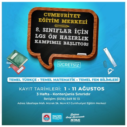 Maltepe Belediyesi, yaz döneminde sekizinci sınıf öğrencileri için üç hafta sürecek ücretsiz Liselere Geçiş Sınavı (LGS) ön hazırlık kampı düzenleyeceğini duyurdu. Dersler Maltepe Belediyesi Kütüphane Müdürlüğü’ne bağlı Cumhuriyet Eğitim Merkezi’nin İdealtepe Mahallesi Mızrak Sokak No:4 Kat:1’de bulunan adresinde hafta içi gerçekleşecek. Kampta yedinci sınıftan sekizinci sınıfa geçen öğrenciler için temel Türkçe, temel matematik, temel fen bilimleri dersleri verilecek.