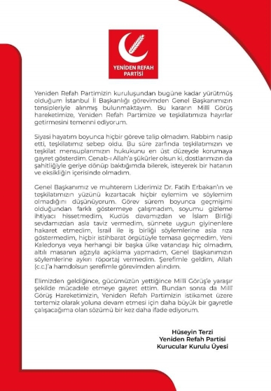 “Yeniden Refah Partimizin kuruluşundan bugüne kadar yürütmüş olduğum İstanbul İl Başkanlığı görevimden Genel Başkanımızın tensipleriyle alınmış bulunmaktayım. Bu kararın Milli Görüş hareketimize, Yeniden Refah Partimize ve teşkilatımıza hayırlar getirmesini temenni ediyorum.