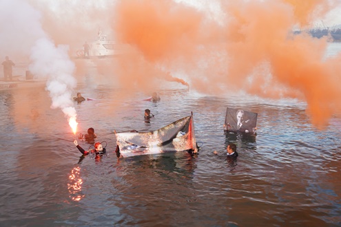 Dalgıçlar, su altında açtıkları Atatürk posterleri ve pankartlarla 09.05’te satha çıkarak yanan meşalelerle görsel bir anma gerçekleştirdi.