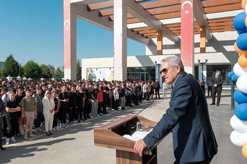 Törende konuşan Okul Müdürü Bülent Seğmen ise "Bu yıl aramıza katılan 9. sınıf öğrencileriyle birlikte, 1494 öğrenci ve 94 personelden oluşan geniş ailemizle yeni eğitim-öğretim yılına başlamanın heyecanını ve gururunu yaşıyoruz. Okulumuzdan mezun olan ve işe girenlerin yüzde 85’i sanayide çalışıyor. Türkiye’de bir ilki gerçekleştirdik ve 11. sınıf öğrencilerimizi işletmelerde staja başlattık. Bizim girişimlerimiz sonucunda artık Millî Eğitim Bakanlığı da 11. sınıf öğrencilerinin staja gitmelerini kendi sistemine ekledi. Türkiye’nin öncü okullarından biri olarak, Türkiye Yüzyılı Maarif Model’inin müfredata eklenmesinde öncü rol üstlendik. Yeni eğitim yılıyla birlikte, bu modelin yürürlüğe girmesiyle okulumuzda 3 ayrı programı uygulamaya başlıyoruz. Tüm öğrencilerimize ve öğretmen arkadaşlarıma yeni dönemde başarılar diliyorum” ifadelerini kullandı.