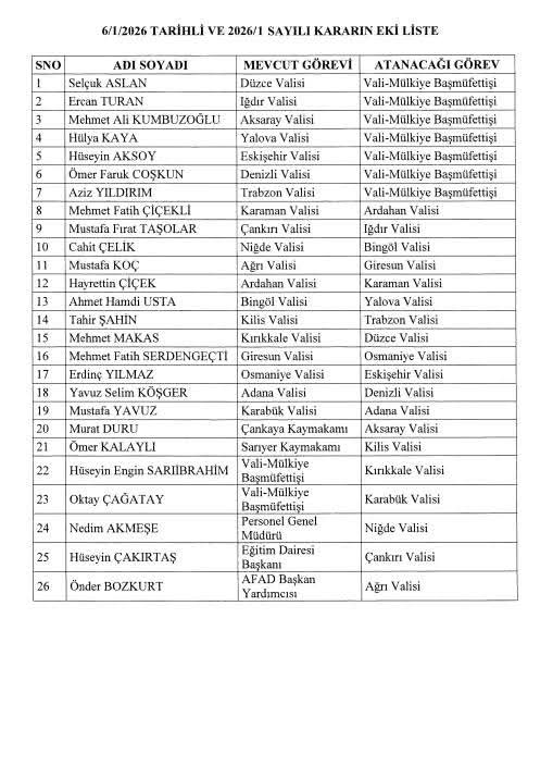 İçişleri Bakanlığı Valiler Kararnamesi Resmi Gazete’de yayımlandı. Başkan Erdoğan'ın imzasıyla yayımlanan kararnameye göre 19 ilin Valisi değişirken, 7 Vali ise Vali Mülkiye Başmüfettişliğine atandı.